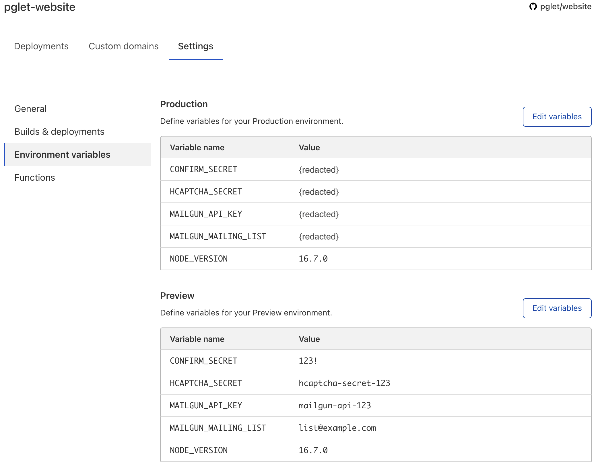 Pglet website is made with Docusaurus and hosted on Cloudflare Pages. However, the following solution could be easily adopted for other React-based website frameworks such as Next.js and use a different backend for server-side logic such as Vercel Functions or Deno Deploy.