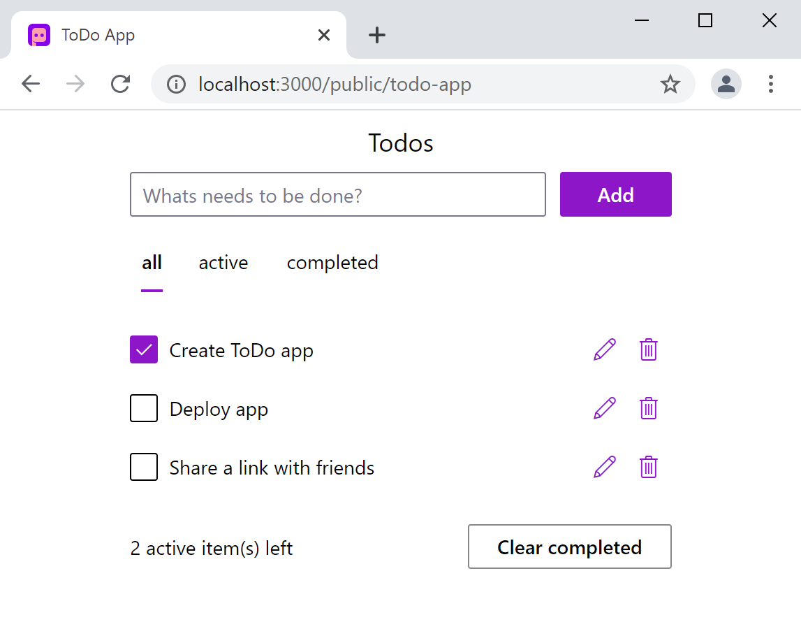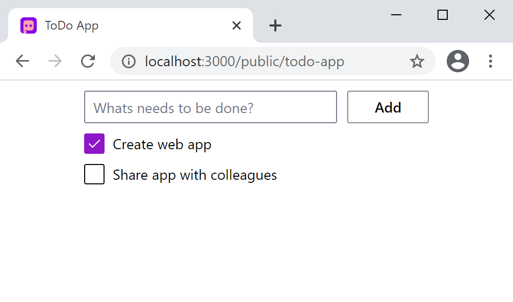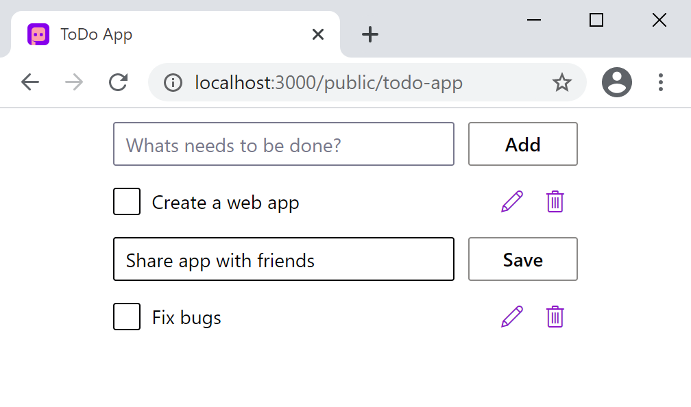 In the previous step, we created a basic ToDo app with task items shown as checkboxes. Let's improve the app by adding "Edit" and "Delete" buttons next to a task name. The "Edit" button will switch a task item to edit mode.